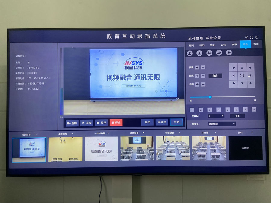 项目包含:本项目共建设1个录播教室,使用1台350vip8888科技(AVSYS)多媒体综合管理一体机,实现统一控制管理,音视频调度,会议室互动等应用。